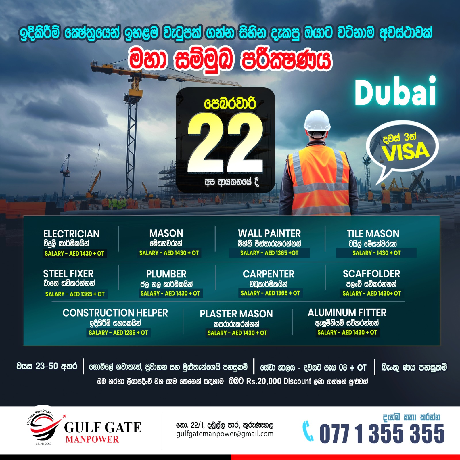 Dubai ඉදි කිරීම් අංශයේ මහා සම්මුඛ පරීක්ෂණය පෙබරවාරි 22 වැනිදා ...
